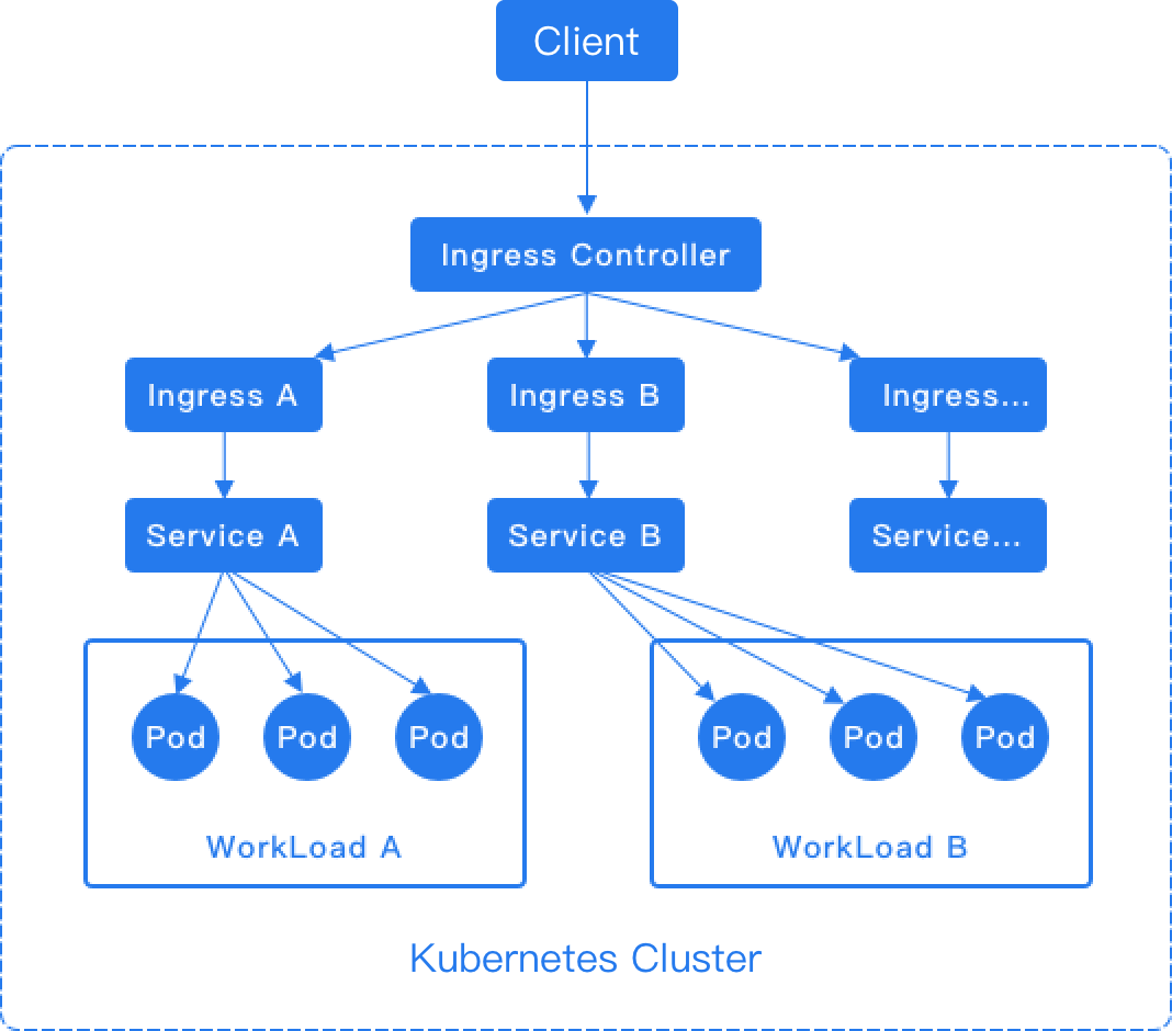 Ingress rules depend on the implementation of the Ingress Controller, which is responsible for listening to changes in Ingress and Service. After a new Ingress is created, when the Ingress Controller receives a request, it matches the forwarding rule from the Ingress and distributes the traffic to the specified internal routes, as shown in the diagram below.